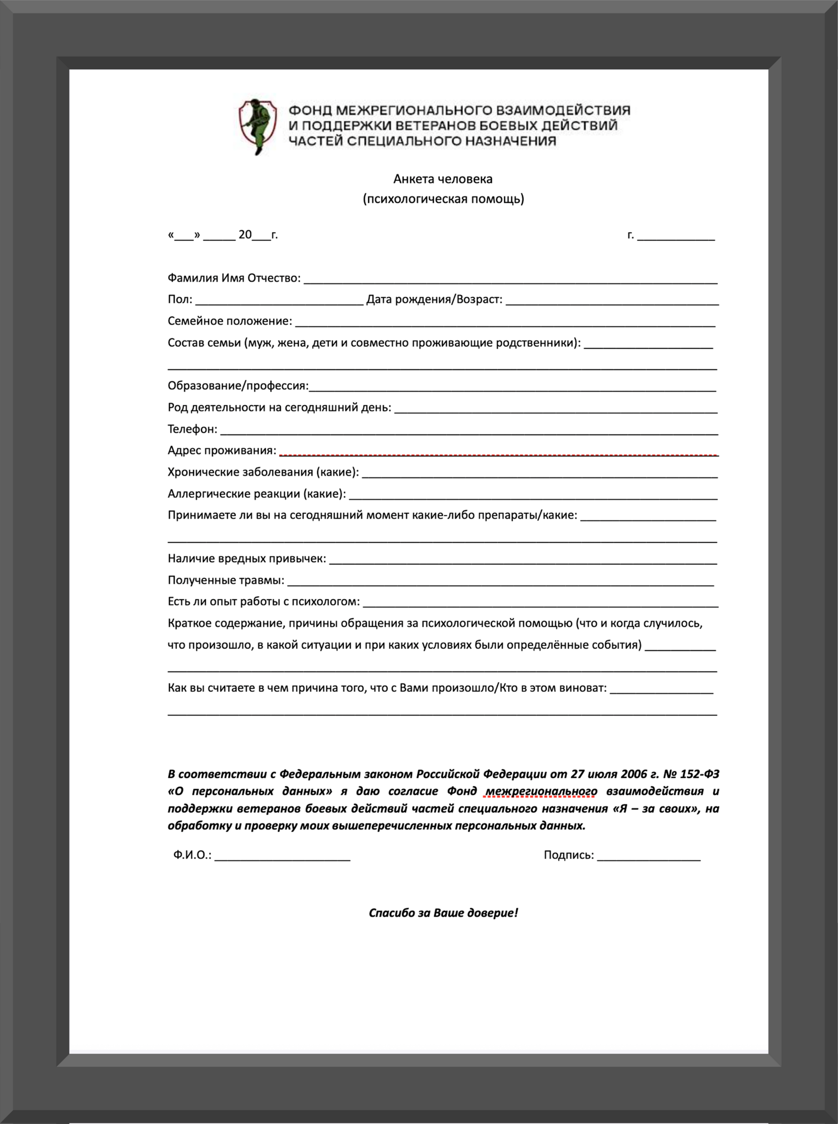 Анкета для оказания психологической помощи